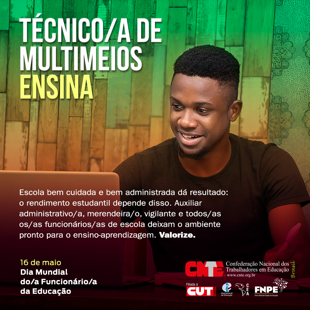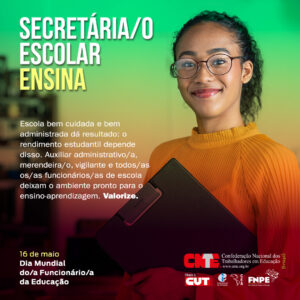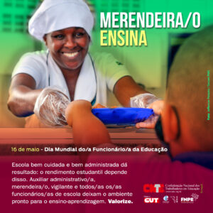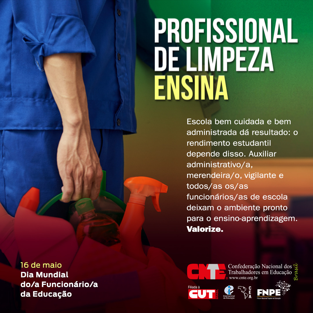 Para marcar a celebração da data, a Confederação Nacional dos Trabalhadores em Educação (CNTE) lançou nesta terça-feira (16) a campanha com o mote “Funcionário/a de escola ensina”. Clique no link abaixo para acessar e participar divulgando nas suas redes sociais.