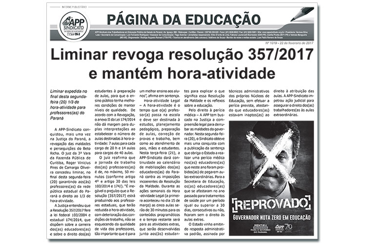 Motivos não faltam para lutar sempre em busca de justiça e do cumprimento da legislação, ainda mais quando envolve a qualidade da educação. Após um início de ano letivo tumultuado com as medidas do governo do Estado, que anunciou deliberações como a Resolução 113/2017 e Resolução 357/2017, um parecer favorável às reivindicações da APP-Sindicato foi […]