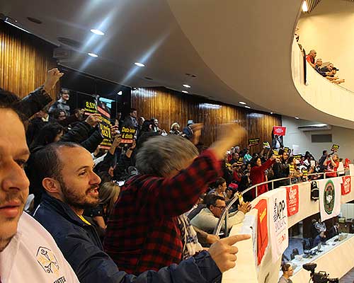 Sob gritos de “pague a data-base” que vinham dos servidores e servidoras que ocupavam os balcões da Assembleia Legislativa do Paraná (Alep), o secretário da Fazenda do Estado, Mauro Ricardo, apresentou a prestação de contas públicas do governo do Paraná, no primeiro quadrimestre do ano. A cada manifestação dos trabalhadores e trabalhadoras, uma ameaça de […]