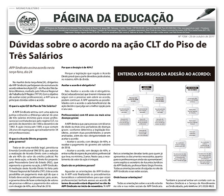Na manhã desta terça-feira(24), dirigentes da APP-Sindicato participaram da assinatura do acordo referente à Ação CLT – do Piso dos Três Salários Mínimos, mediado pelo Tribunal Regional do Trabalho da 9ª Região (TRT 9ª). Com o objetivo de auxiliar os(as) professores(as), a APP sana as principais dúvidas sobre o acordo: O que é a ação […]