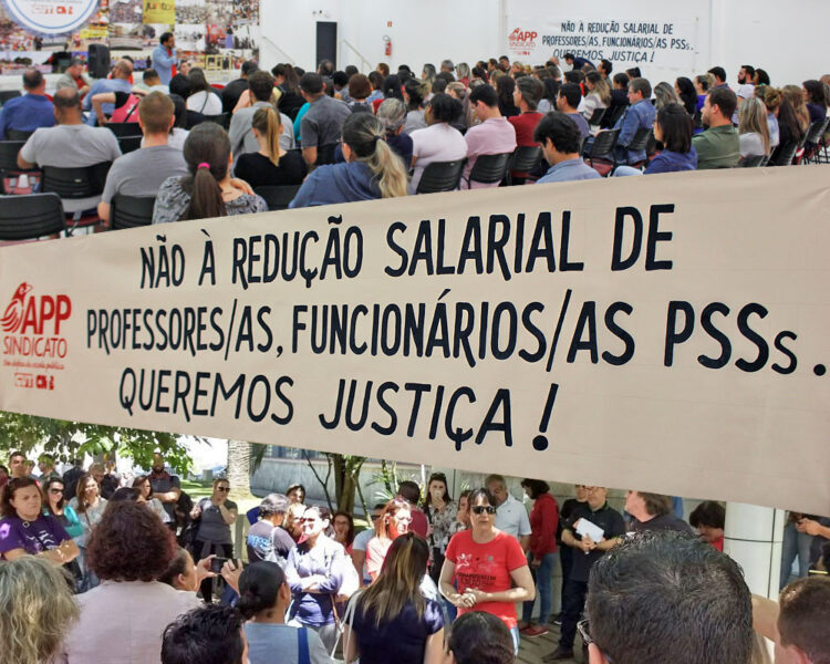 O coletivo estadual de professores(as) e funcionários(as) contratados(as) temporários – PSS, reunidos(as) na manhã desta segunda-feira (13/11), em Curitiba, organizados a partir da APP-Sindicato, vem a público repudiar o anúncio de integrantes do governo Beto Richa (PSDB), em querer diminuir o salário desse segmento em R$ 500,00 reais por jornada de 20h. Hoje, no Estado, […]