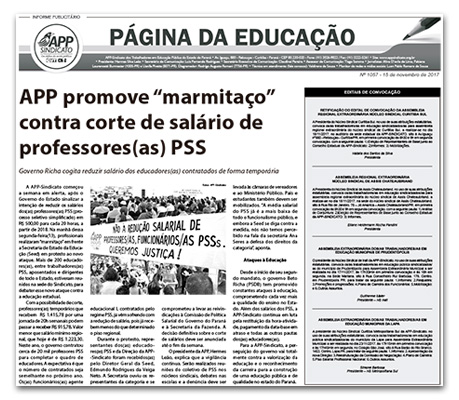 Nessa segunda-feira(13) foi aprovado pela mesa diretora da Assembleia Legislativa do Paraná (Alep), requerimento apresentado pelo deputado Professor Lemos (PT), que pede a suspensão do estudo que visa reduzir o salário dos(as) contratados(as) em regime especial (PSS) para professores(as) da rede estadual de educação, em 2018. O documento será agora encaminhado ao governador Beto Richa […]