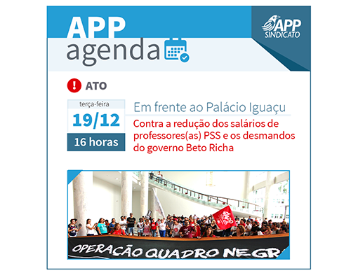 Em reunião com a Casa Civil, secretários(as) de Estado, Ministério Público (MP) e deputados estaduais, comissão de negociação da APP-Sindicato exigiu a alteração do edital que reduz os salários dos(as) professores(as) PSS para 2018. A APP demonstrou, com estudos financeiros já apresentados ao longo do ano, que o governo tem condições de manter os salários […]