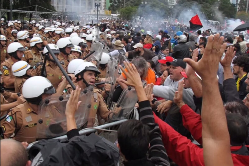 Trabalhadores(as) na luta, denunciando os ataques do governo Beto Richa contra os professores e a educação pública do Paraná
