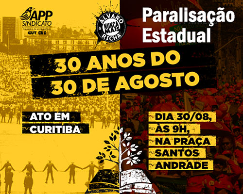 A APP-Sindicato está preparando a grande manifestação pública do próximo dia 30 de agosto. No dia, serão lembrados os 30 anos do ataque brutal aos(às) professores(as) que, em 1988, cobravam correção salarial. A violência e covardia do então governo Álvaro Dias e também a barbárie do 29 de abril de 2015, orquestrada pelo ex-governador Beto […]