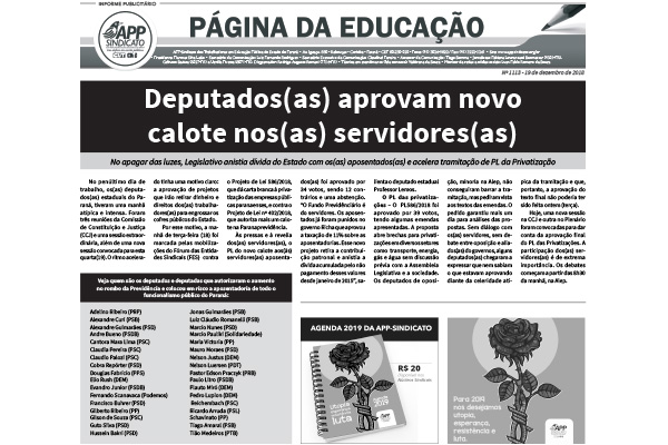 Na manhã desta quarta-feira (19), durante a última sessão legislativa do ano, a maioria dos(as) deputados(as) estaduais do Paraná disse ‘Sim’ para o Projeto de Lei 586/2018, que dá carta branca às privatizações no Estado. Foram 32 votos favoráveis e 5 contrários. As emendas propostas pela oposição foram barradas. O Fórum das Entidades Sindicais […]