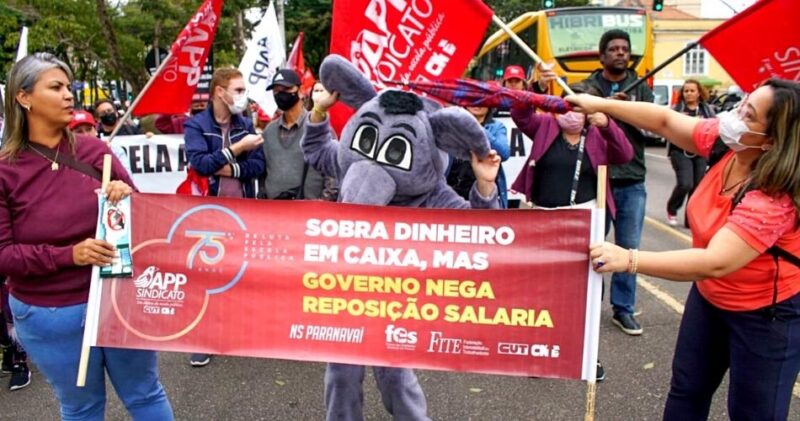 A chuva e o frio não impediram que educadores(as) e estudantes denunciassem o governo de faz de conta de Ratinho Jr. Na tarde desta quarta-feira (1) durante o lançamento do novo programa do governo “Mais Merenda”, trabalhadores(as) se reuniram em frente ao Colégio Estadual Zumbi dos Palmares, no município de Colombo, para cobrar a reposição […]