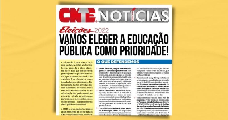 >> Clique aqui para baixar o jornal mural A Confederação Nacional dos(as) Trabalhadores(as) em Educação lançou um jornal mural focado no período eleitoral e na importância de eleger políticos(as) e partidos comprometidos com a escola pública, a valorização dos(as) educadores(as) e serviços públicos de qualidade. A educação é uma das principais pautas de todas as […]