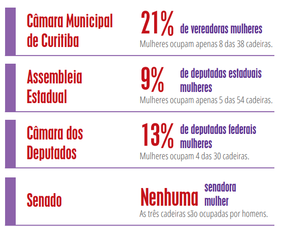 Mesmo sabendo que as mulheres são afetadas diretamente por leis e políticas que não respeitam suas escolhas, como os enlaces da maternidade, do machismo, por exemplo, entre tantos outros entraves que dificultam a participação em várias áreas.