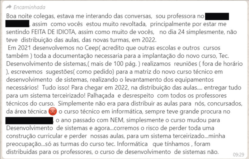 Quando chegou a distribuição de aulas, os(as) educadores(as) descobriram que foram usados pelo Estado. O golpe é resumido por uma professora QPM de outra cidade, cuja mensagem reproduzimos abaixo omitindo informações a pedido da fonte.