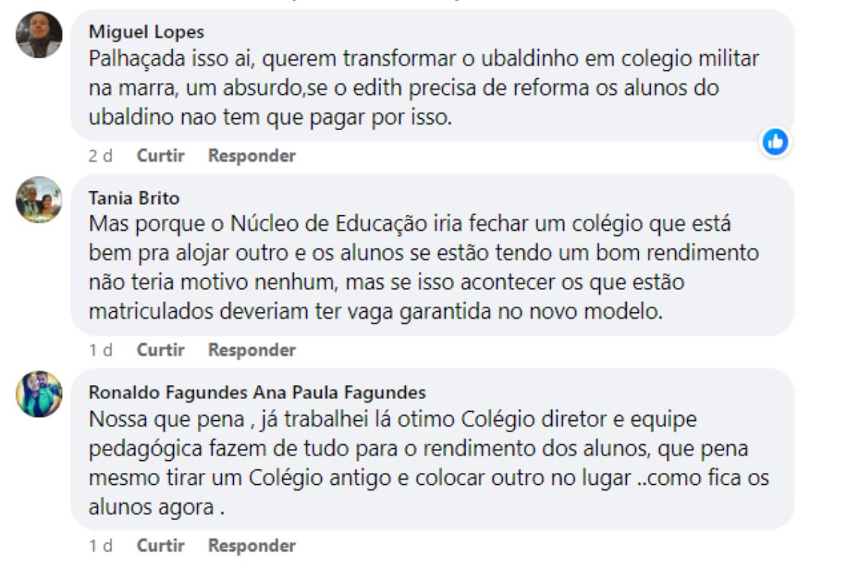 Em outra postagem, um internauta escreveu que a situação é uma “palhaçada” e afirma que o governo quer transformar o Ubaldino em escola militar “na marra”. Outro usuário questiona a decisão do NRE, já que o colégio tem registrado um bom rendimento. Elogios à direção e a equipe pedagógica também aparecem nos comentários.