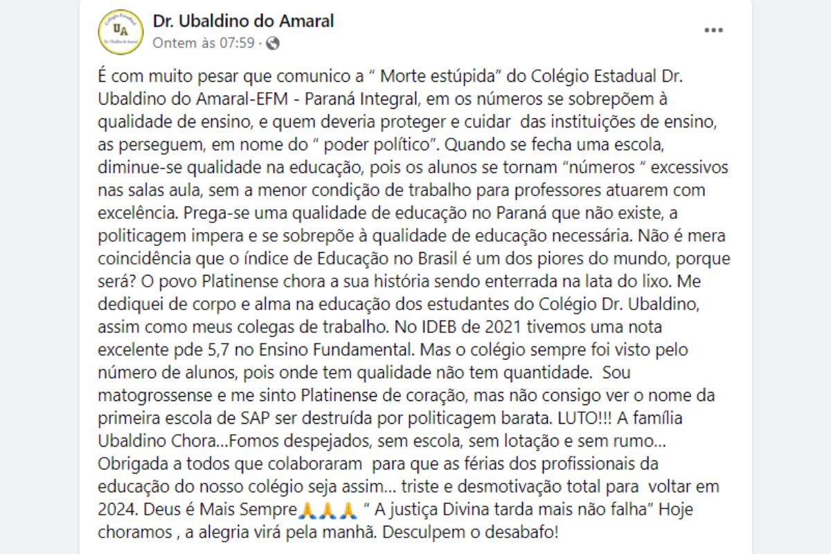 Em texto publicado em uma página da escola em uma rede social, o encerramento das atividades é duramente criticado. “É com muito pesar que comunico a “morte estúpida” do Colégio Estadual Dr. Ubaldino do Amaral-EFM – Paraná Integral, em [que] os números se sobrepõem à qualidade de ensino, e quem deveria proteger e cuidar das instituições de ensino, as perseguem, em nome do “ poder político”. Fomos despejados, sem escola, sem lotação e sem rumo”, diz a postagem.