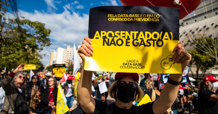 O Sindicato defende mudanças no desconto previdenciário para aposentados(as). Com a reforma da Previdência, a contribuição passou para 14% sobre benefícios que ultrapassam três salários mínimos. A taxação injusta faz com que uma professora aposentada receba hoje menos do que recebia em 2019. A APP defende isenção do desconto até o teto do INSS (R$ 7,5 mil).