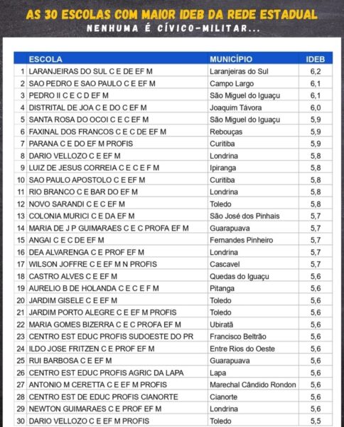 Anunciados pelo governo Ratinho Jr. como se fossem uma fórmula mágica para melhoria da educação, todos os colégios cívico-militares implantados na rede estadual apresentam resultados no Ideb inferiores ao de dezenas de escolas com gestão democrática.