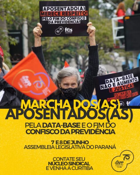 Nos dias 7 e 8 de junho, educadores(as) aposentados(as) têm um encontro marcado com a luta. A APP-Sindicato convoca a Marcha dos(as) Aposentados(as), movimento de pressão pela data-base e pelo fim do desconto previdenciário abaixo do teto do INSS.