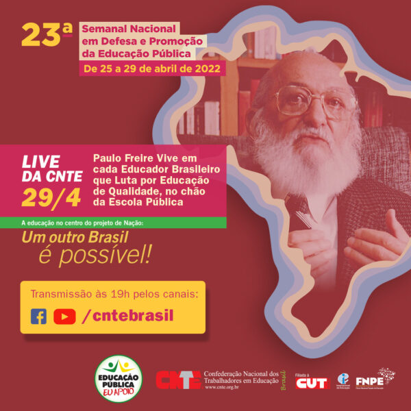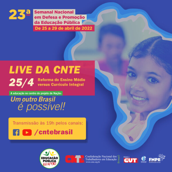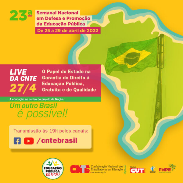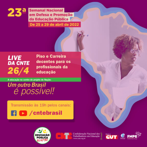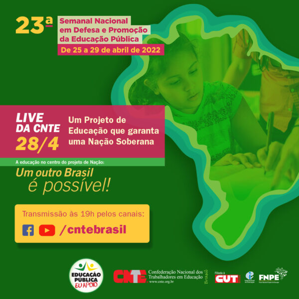 A APP-Sindicato integra a 23ª edição da Semana Nacional em Defesa e Promoção da Educação Pública, a programação é formada por atividades diárias de 25 a 29 de abril de 2022, que serão realizadas de modo virtual, ainda devido aos cuidados decorrentes da pandemia do Covid-19. As lives serão transmitidas pela página da CNTE no Youtube e compartilhadas pela APP-Sindicato.