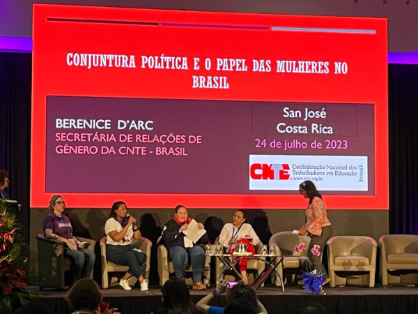 Representando o Brasil, a secretária de Relações de Gênero da CNTE, Berenice D’arc, apresentou o painel “Conjuntura Política e o Papel das Mulheres no Brasil”. A dirigente falou da renovação da esperança das mulheres brasileiras e latino-americanas, trazida com a eleição e a posse do presidente Lula.