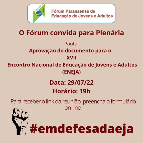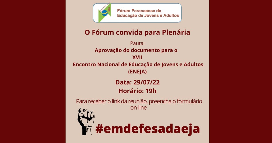 Nesta sexta-feira (29), às 19h, online (pelo Google Meet), acontece a Plenária de aprovação de um documento com os princípios defendidos para a Educação de Jovens e Adultos (EJA) #emdefesadaEJA.