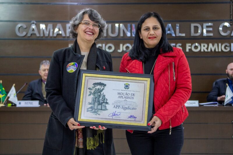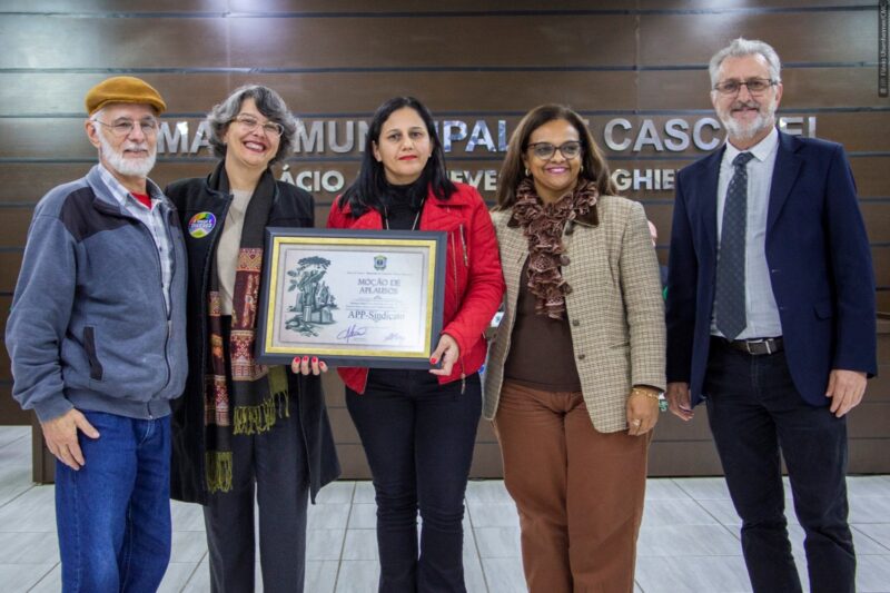 A APP-Sindicato recebeu, nesta terça-feira (13), uma homenagem da Câmara Municipal de Cascavel, em reconhecimento aos 76 anos de luta da entidade na defesa dos(as) trabalhadores(as) da educação pública do Paraná. A honraria, a Moção de Aplausos nº 30/2023, foi proposta pela vereadora Professora Liliam (PT) e aprovada por unanimidade.