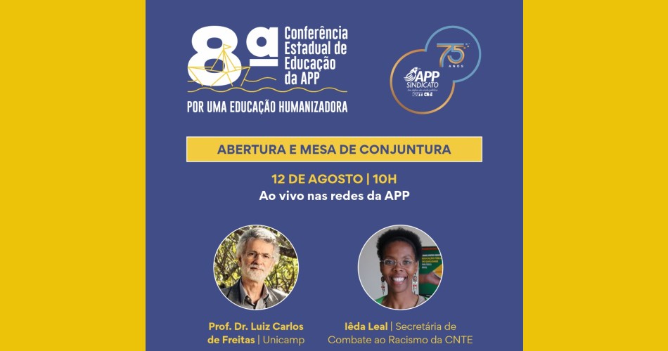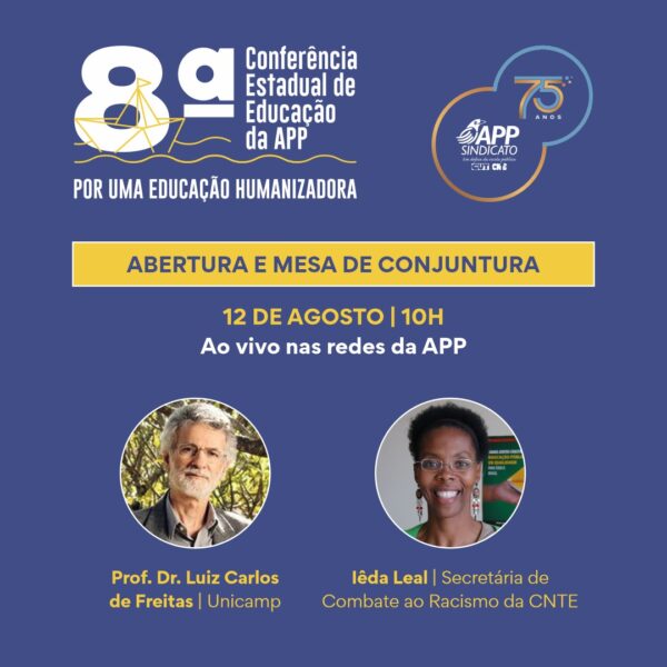 Amanhã (12) é o grande dia! Começa a 8ª Conferência Estadual de Educação da APP-Sindicato, em Curitiba, com transmissão ao vivo da abertura, às 8h30, e da mesa de conjuntura, às 10h. Acompanhe nas redes da APP.