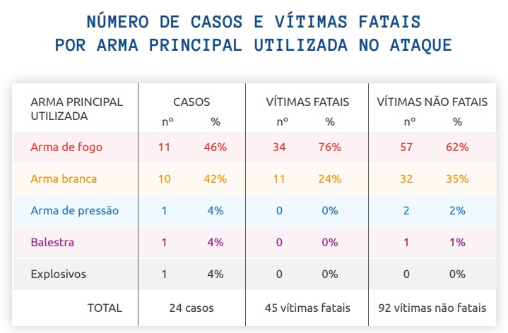 Os dados integram estudo divulgado pelo Instituto Sou da Paz, que analisa 24 ataques a escolas ocorridos no Brasil entre 2002 e abril de 2023, com 45 vítimas fatais e 92 não fatais.
