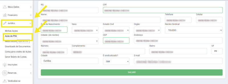 4. No menu lateral, clique em Jurídico e, após, em Ação do PSS.