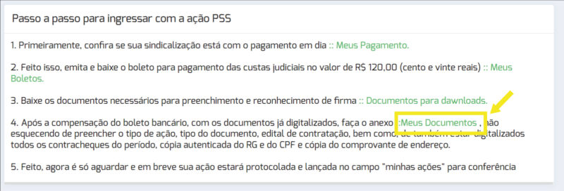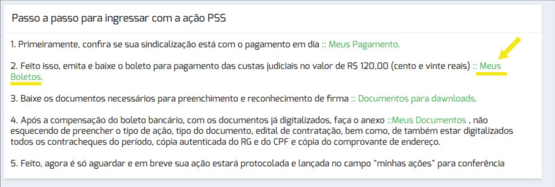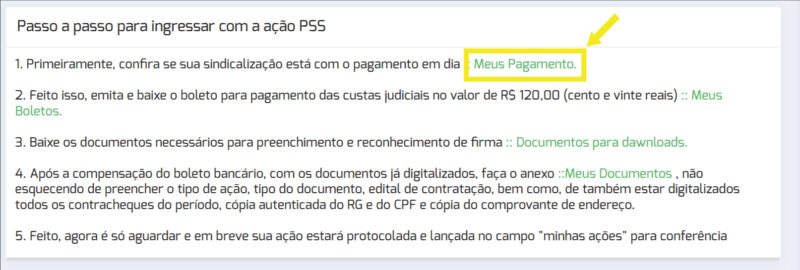 5. Após clicar em Ação do PSS, você terá acesso a um passo a passo. Leia atentamente e siga as instruções. Primeiro, confira se a sua sindicalização está em dia. Clique em Meus Pagamentos. Se houver algum problema, será possível emitir o boleto de mensalidades faltantes para regularizar a sua situação junto à APP.