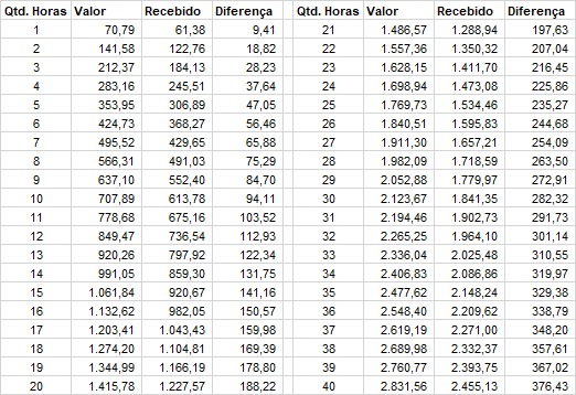 A tabela abaixo apresenta valores aproximados da diferença mensal de acordo com o número de horas contratadas. Para saber o valor aproximado a receber, basta multiplicar o campo “diferença” pelo número de meses trabalhados com a sua carga horária. Fazendo a consulta, é possível calcular se compensa financeiramente ingressar com a ação, uma vez que trabalhadores(as) com menos tempo de contrato podem ter pouco a receber. A tabela está sujeita a alterações.