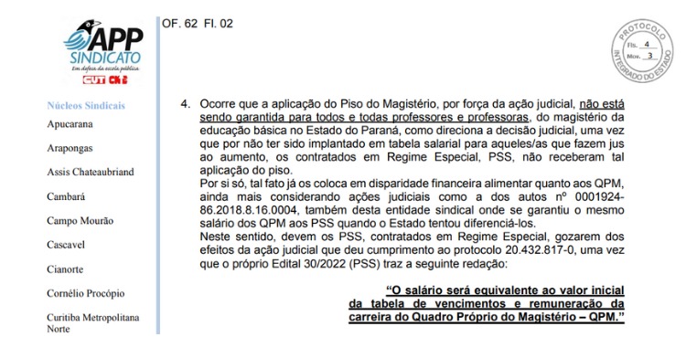 O Sindicato notificou imediatamente a Seed de que a não garantia do Piso do aos docentes contratados(as) em regime especial configura também o descumprimento de outra ação impetrada pelo Sindicato, que garantiu o mesmo salário dos(as) QPM aos PSS.
