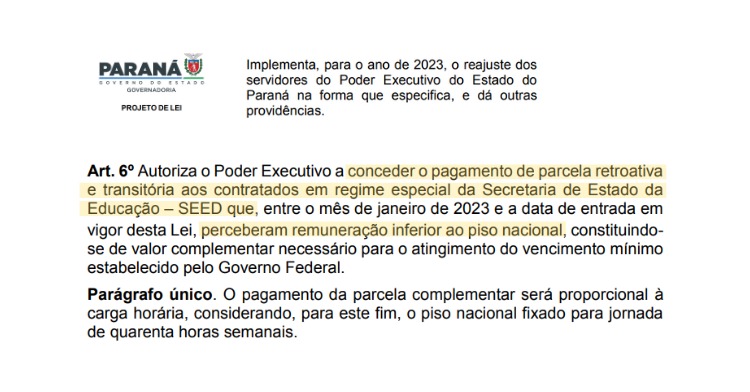 A reivindicação foi apresentada pelo Sindicato à Secretaria da Educação (Seed) e atendida na redação do artigo sexto do Projeto de Lei nº 532/2023, enviado nesta semana à Assembleia Legislativa do Paraná pelo governo.