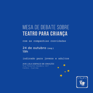 24/10 (segunda-feira) às 19h – Mesa de Debate “Teatro para Criança” com Companhia Ave Lola, Grupo Obragem de Teatro, Ailén Roberto, Batida (Dinamarca) e integrantes do grupo Plan D (Holanda).