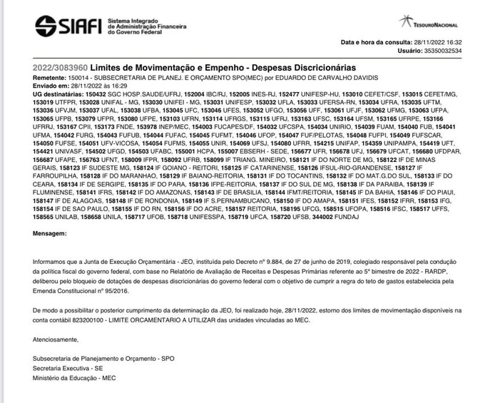 A justificativa do corte, registrada no Sistema Integrado de Administração Financeira (Siafi), é manter a responsabilidade fiscal. O texto afirma que a Junta de Execução Orçamentária decidiu pelo corte com o objetivo de cumprir a Lei do Teto de Gastos, legislação que o governo federal descumpriu nos últimos quatro anos, acumulando um rombo de quase R$ 800 bilhões. O comunicado informa também que foi feito o estorno (devolução) dos limites disponíveis nas contas.