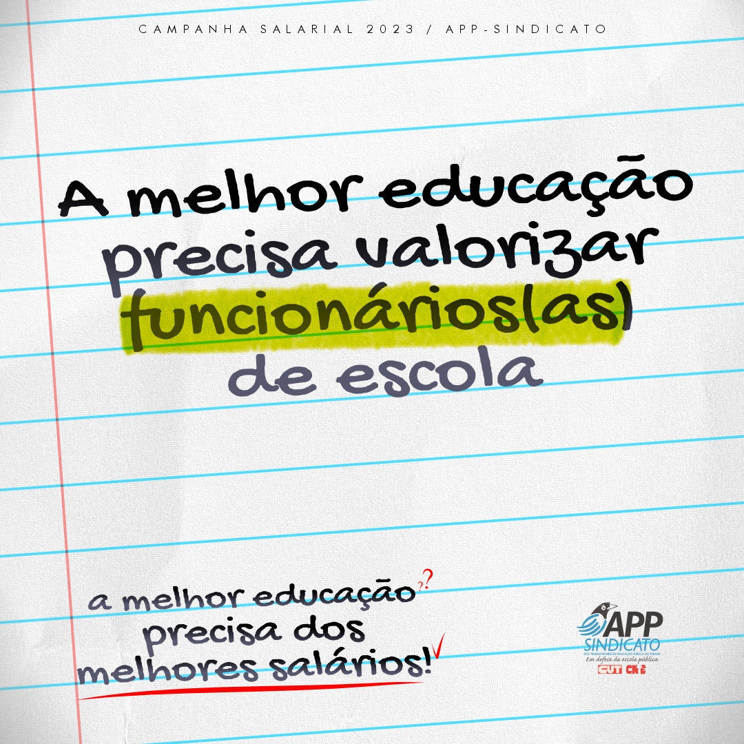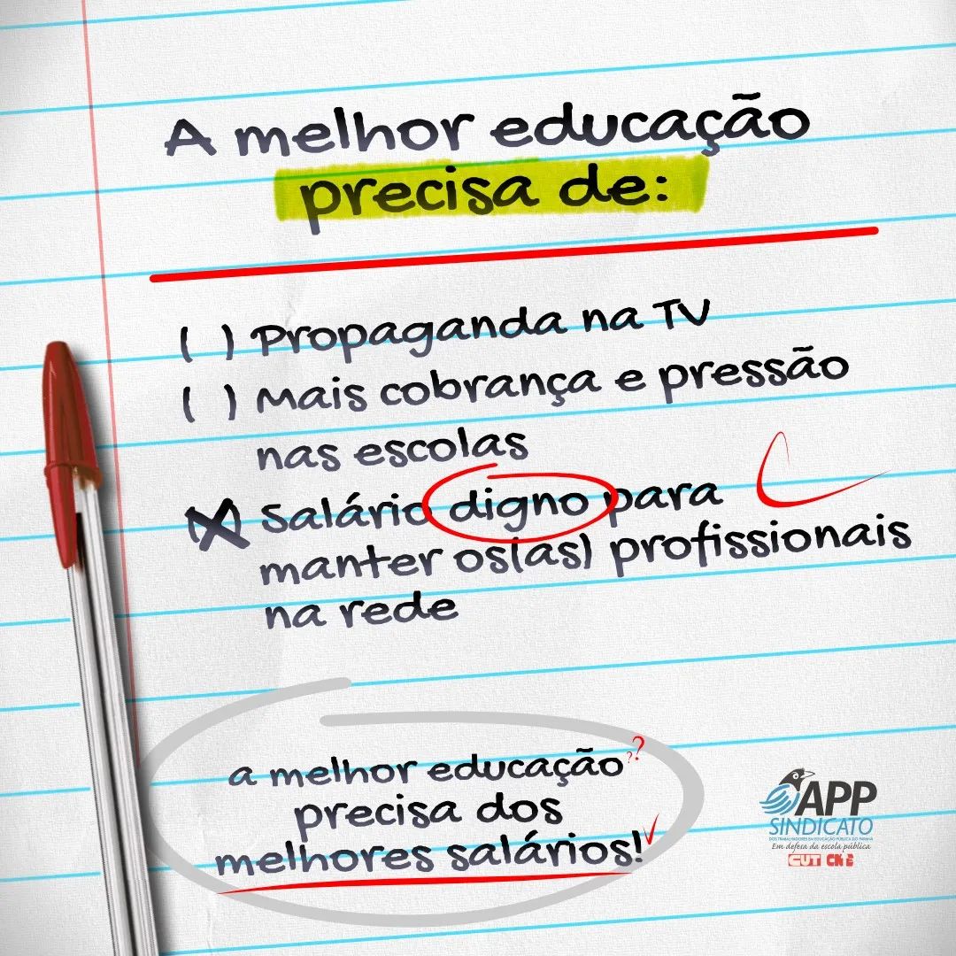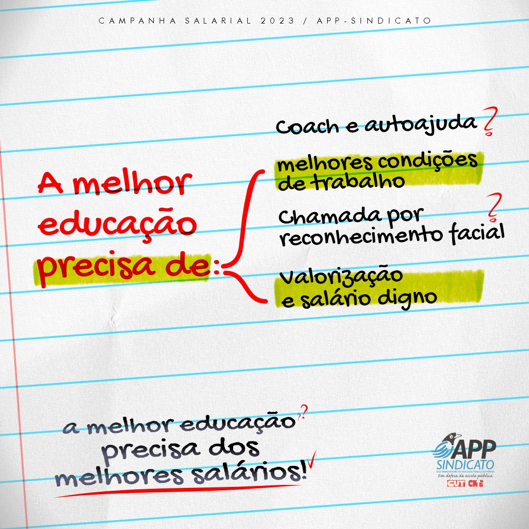 Com o mote “A melhor educação precisa dos melhores salários”, a campanha salarial da APP faz referência à propaganda do governo sobre a qualidade da educação do Paraná, contrastando com a desvalorização da categoria. Ao longo do mês de março, o Sindicato realiza diversas publicações nas redes sociais expondo a realidade dos(as) educadores(as), além de trabalhar com materiais impressos nas escolas.
