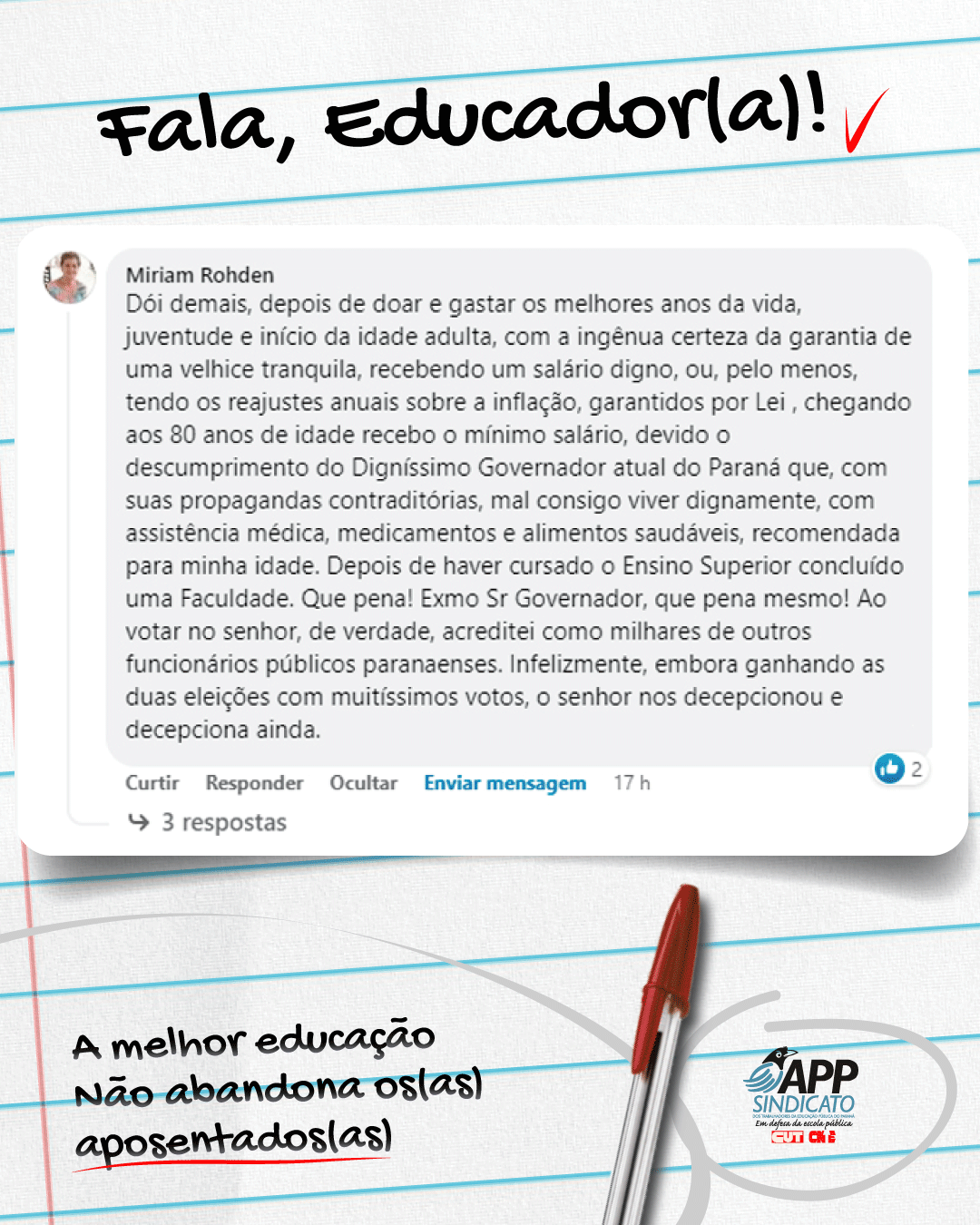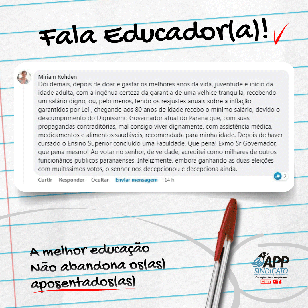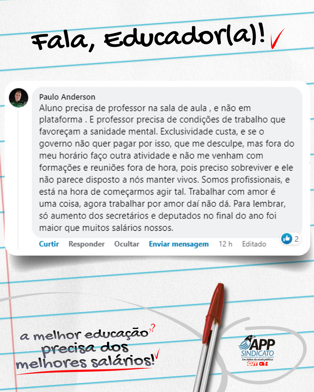 Com o mote “A melhor educação precisa dos melhores salários”, a campanha salarial da APP faz referência à propaganda do governo sobre a qualidade da educação do Paraná, contrastando com a desvalorização da categoria. Ao longo do mês de março, o Sindicato realiza diversas publicações nas redes sociais expondo a realidade dos(as) educadores(as), além de trabalhar com materiais impressos nas escolas.