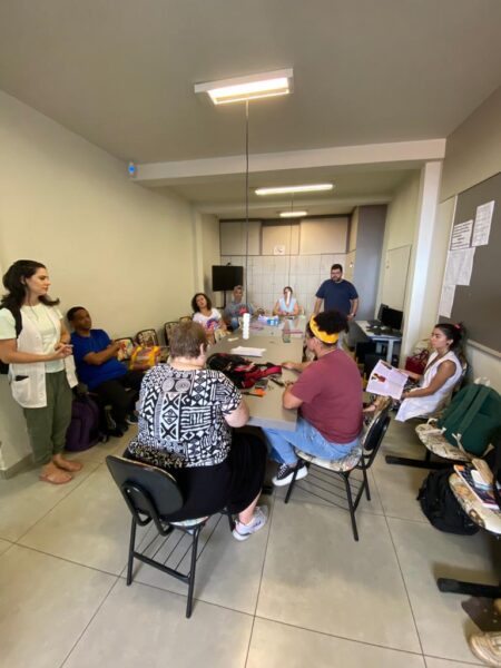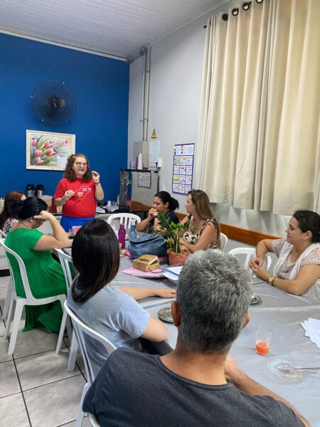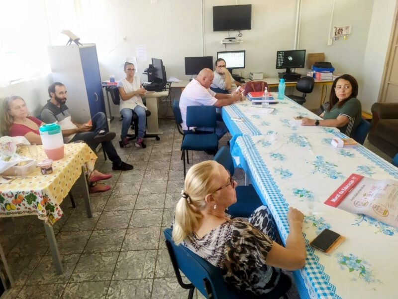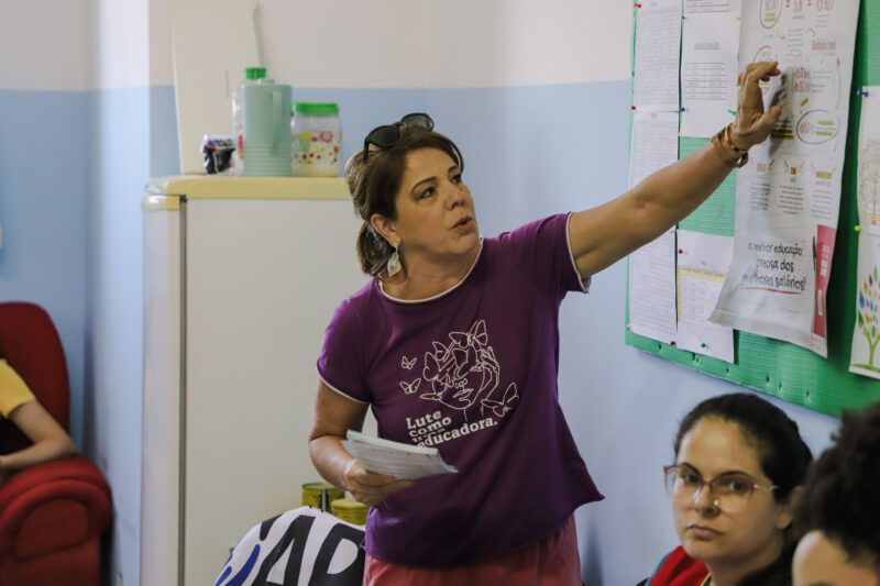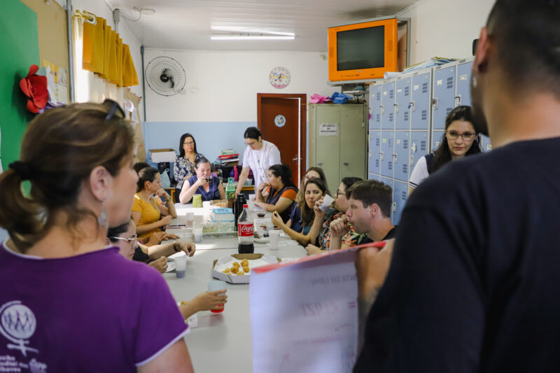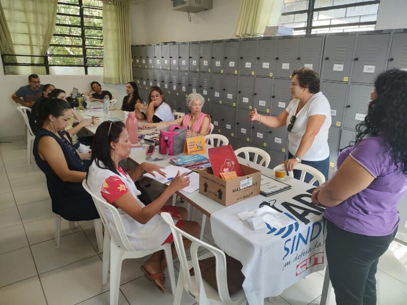 Falta de autonomia no trabalho pedagógico, deficiências no atendimento à saúde, concurso público e plataformização do ensino foram alguns dos temas abordados nas conversas das dirigentes com os(as) educadores(as).