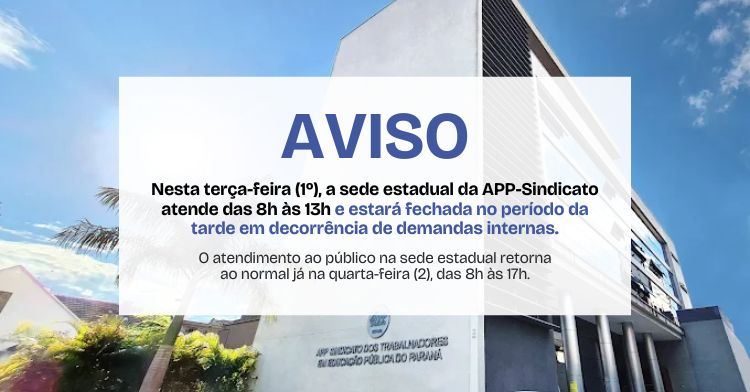 Excepcionalmente nesta terça-feira (1º), o atendimento da sede estadual da APP-Sindicato será realizado das 8h às 13h. O prédio estará fechado no período da tarde em decorrência de demandas internas. >> Receba notícias da APP no seu Whatsapp ou Telegram A medida não afeta o horário de atendimento dos núcleos ...