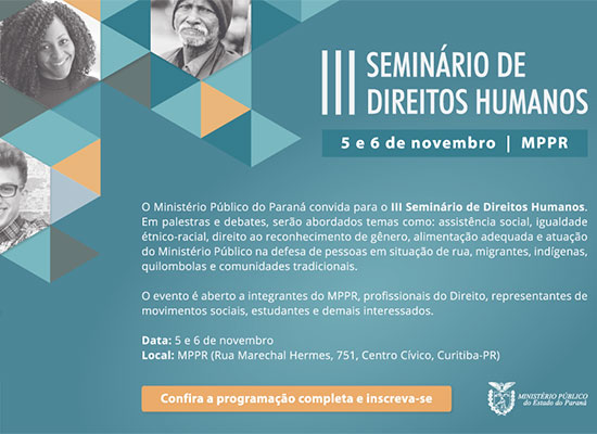 No início do mês de novembro, dias 5 (segunda-feira) e 6 (terça-feira), das 8 horas às 18h30, acontecerá o III Seminário de Direitos Humanos, na sede do Ministério Público do Paraná (MPPR), em Curitiba (PR). Através do Centro de Apoio Operacional das Promotorias de Justiça de Proteção aos Direitos Humanos, ...