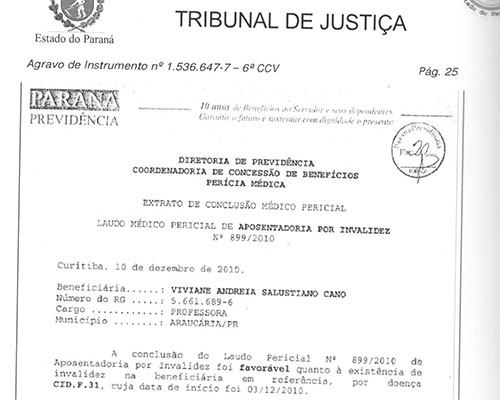 Notícia urgente de justiça feita para a professora da rede pública, Viviane Andréia Salustiano Cano Laverde, contra a administração do governo do Estado. Nessa sexta-feira (01), o Tribunal de Justiça do Estado do Paraná (TJ-PR) reconhece o direito de aposentadoria por invalidez da educadora por motivos de doença (CID.F.31 – ...