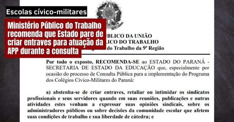 :: Receba notícias da APP no Whatsapp ou Telegram A APP-Sindicato está mobilizada em todas as frentes para barrar a tentativa do governo Ratinho Jr. de militarizar 127 escolas da rede estadual ainda neste ano. Em petição enviada ao Ministério Público do Paraná (MPPR) na noite de sexta (10), poucas ...