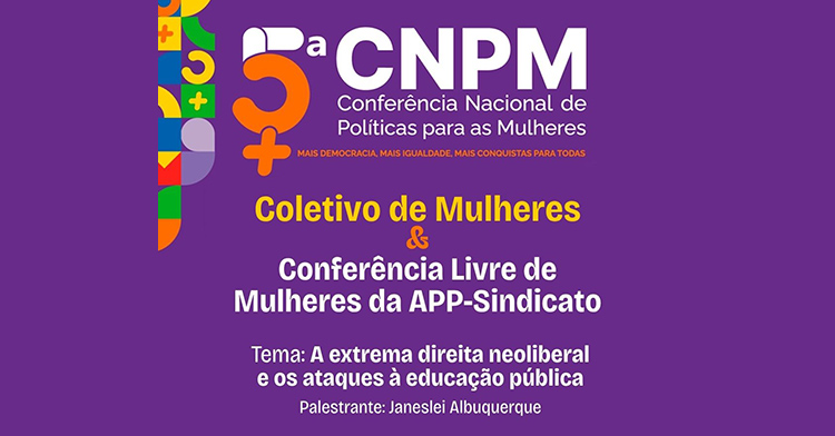Em um movimento estratégico para consolidar a pauta feminina da educação pública no cenário político nacional, a APP-Sindicato se prepara para realizar no próximo dia 5 de agosto, às 18h30, uma etapa livre virtual da 5ª Conferência Nacional de Políticas para as Mulheres (5ª CNPM). :: Receba notícias da APP ...