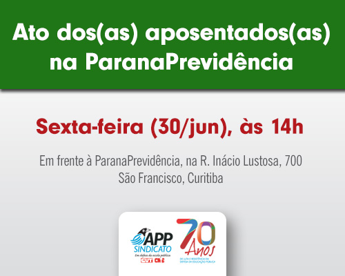 Na próxima sexta-feira (30), dia de Greve Geral dos(as) Trabalhadores(as), os(as) educadores(as) aposentados(as) farão um ato em frente à ParanaPrevidência, às 14h. A mobilização tem o intuito de cobrar a implementação e pagamento das promoções e progressões em atraso para aqueles(as) que tinham direito de receber e se aposentaram antes ...