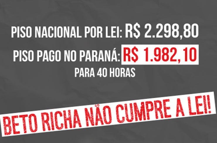 O Ministério da Educação (MEC) anunciou na tarde de hoje (12) o novo valor do piso salarial dos(as) professores(as) para 2017. Com ajuste de 7,64% a nível nacional, cresce ainda mais a defasagem do que ganham os(as) professores(as) paranaenses e o que determina a Lei Nacional do Piso. Graças ao ...