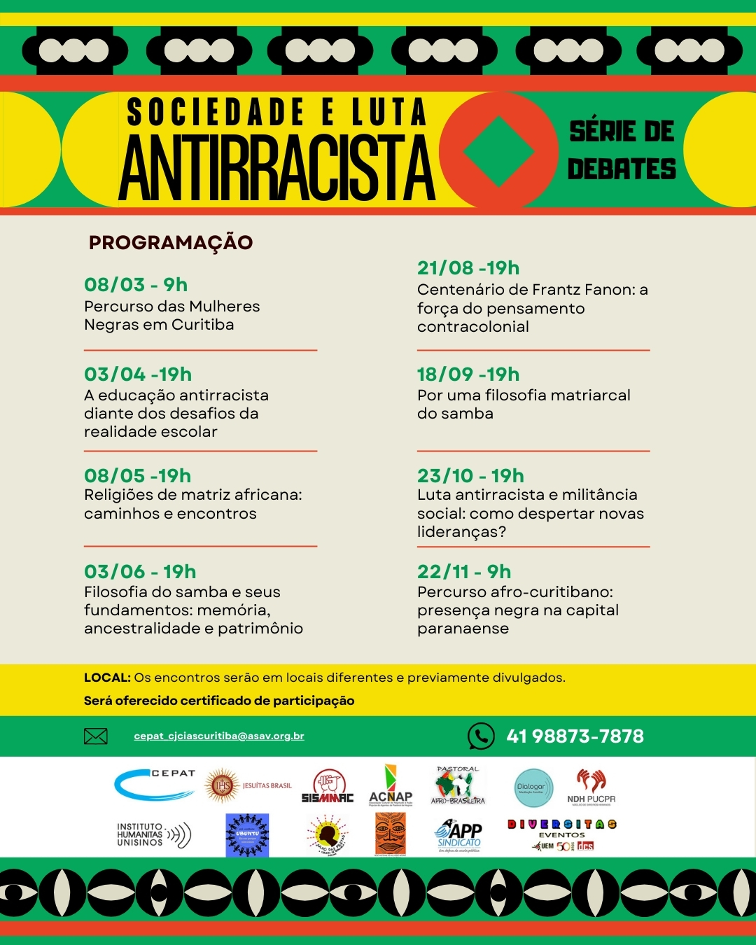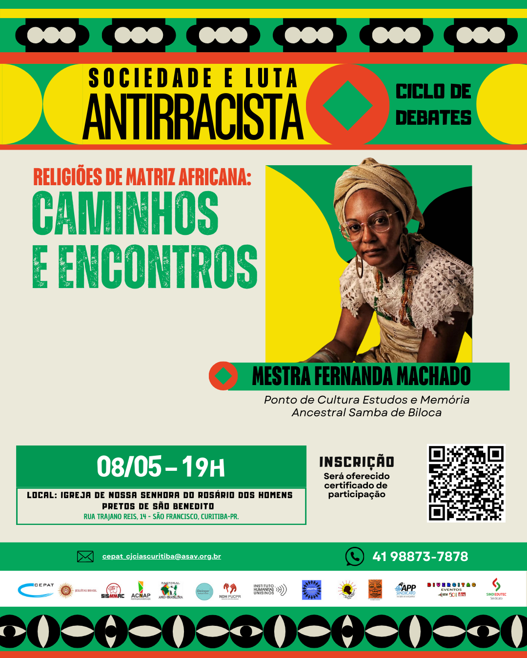 Nesta quinta-feira (6), a Igreja do Rosário dos Homens Pretos de São Benedito sediará o terceiro encontro do ciclo e debates intitulado “Sociedade e Luta Antirracista”, iniciativa promovida pelo Centro de Promoção de Agentes de Transformação (CEPAT). O evento acontecerá na Rua Trajano Reis, 14 – São Francisco, Curitiba-PR, com início às 19h.