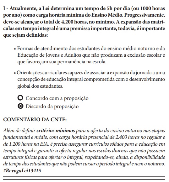 4. Após marcar a opção “Discordo”, copie e cole o comentário da CNTE no campo “Comentários ou proposições” da consulta