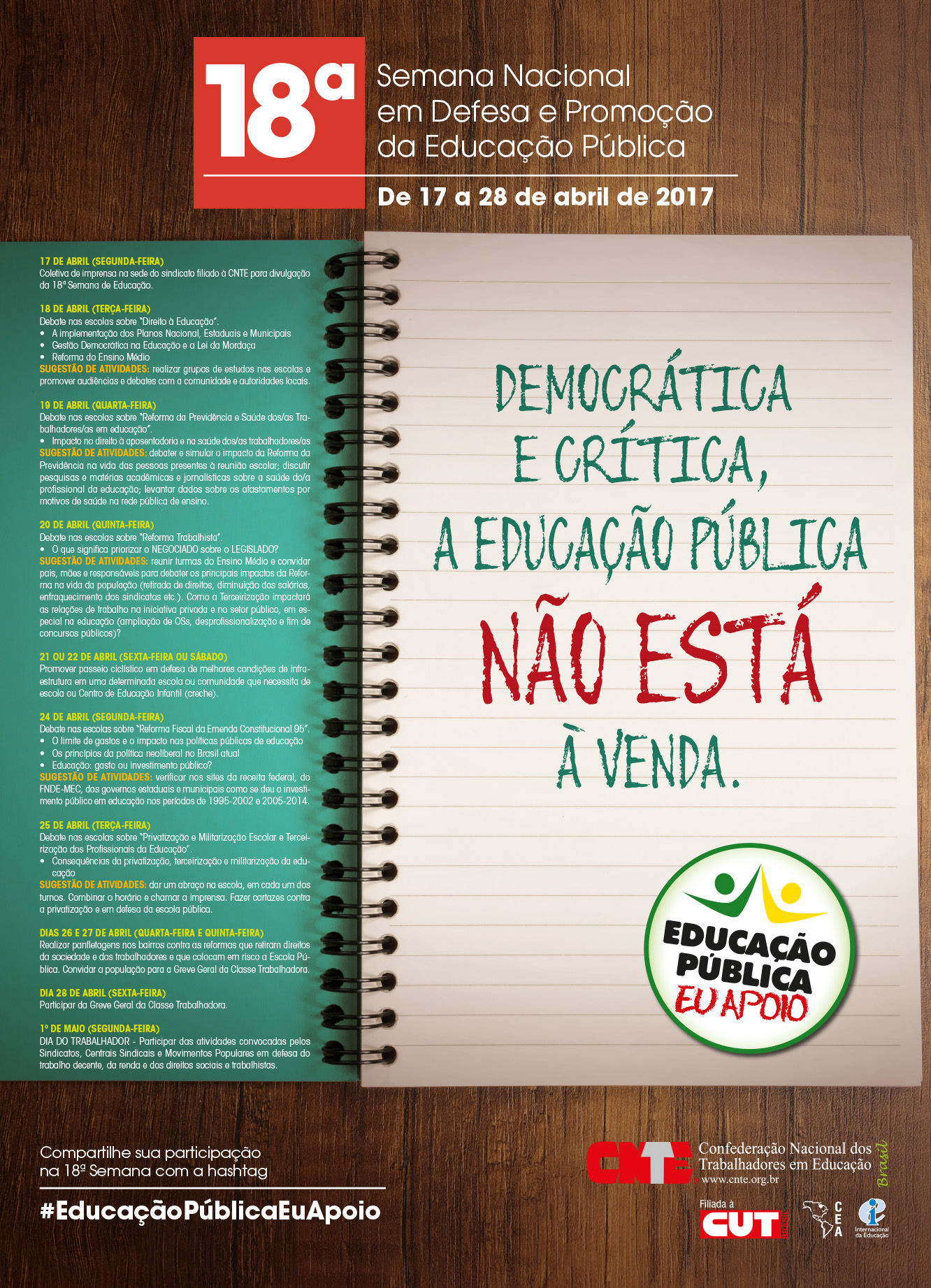 A Confederação Nacional dos Trabalhadores em Educação (CNTE) promove a 18ª Semana Nacional em Defesa e Promoção da Educação Pública com o tema Democrática e Crítica: A Educação Pública Não Está À Venda, entre os dias 17 e 28 deste mês.