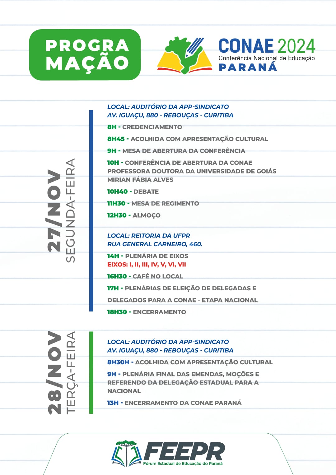 É a etapa estadual da Conferência Nacional Extraordinária da Educação (Conae 2024), a coroação de um extenso ciclo de debates que envolveu 32 etapas regionais, 19 plenárias dos segmentos educacionais e setores sociais ao longo de outubro e novembro. Ao todo, mais de 6.000 pessoas participaram dos espaços de discussão.