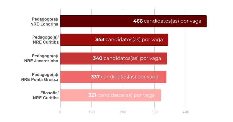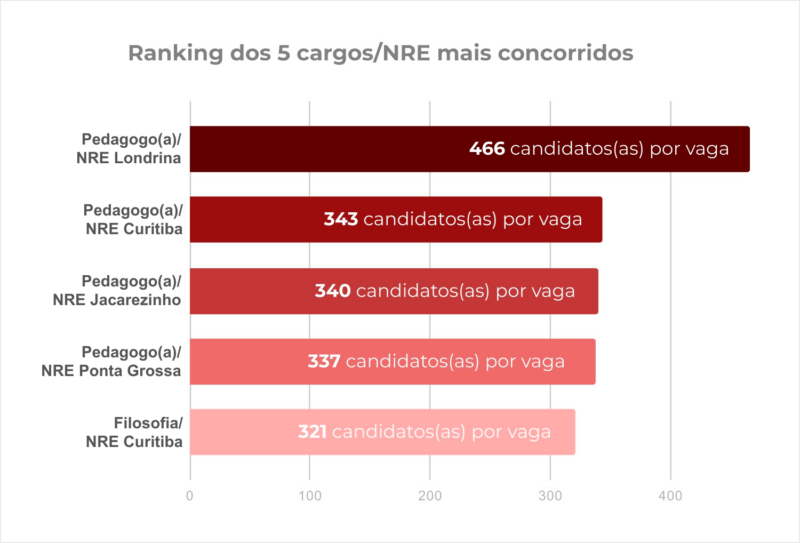 Os cargos para exercer a função de pedagogo(a) e para dar aula de filosofia estão entre os cinco que apresentam as maiores concorrências de todo o concurso. Pedagogia, no NRE de Londrina, lidera o ranking com 466 inscrições por vaga. Na sequência aparece o mesmo cargo nos NREs de Curitiba (343), Jacarezinho (340), e Ponta Grossa (337). Na quinta posição, os(as) 321 inscritos(as) para Filosofia no NRE de Curitiba disputam uma única vaga.