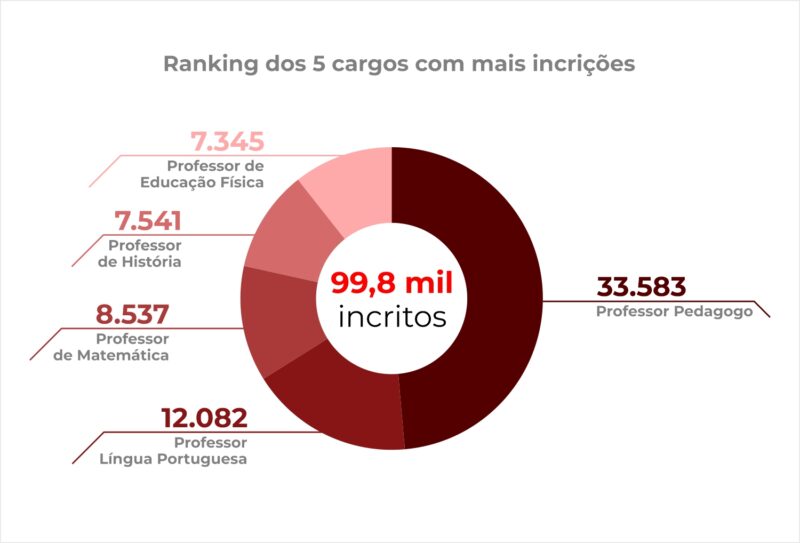Mais de 76 mil pessoas vão disputar apenas 1.256 vagas distribuídas entre os NREs e 14 cargos diferentes, sendo 1.109 oportunidades para 13 disciplinas da matriz curricular e 147 vagas para pedagogo(a). Como havia a possibilidade de se candidatar a mais de um cargo, foram contabilizadas 99.799 inscrições.