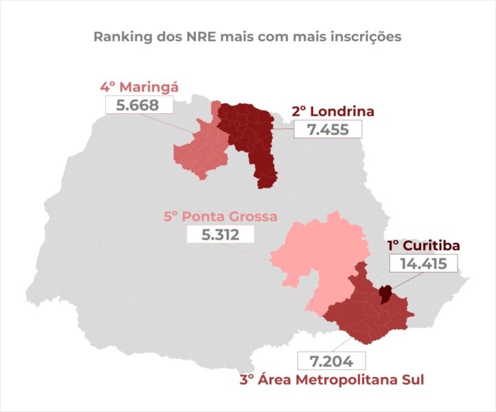 Na lista dos cinco NREs com maior número de inscritos, Curitiba lidera com 14.415, seguido de Londrina (7.455), Área Metropolitana Sul (7.204), Maringá (5.668) e Ponta Grossa (5.312). No ranking dos cargos com mais candidatos(as), Pedagogo(a) aparece em primeiro lugar com 33.583 inscrições, tendo na sequência Língua Portuguesa (12.082), Matemática 8.537, História 7.541 e Educação Física 7.345.
