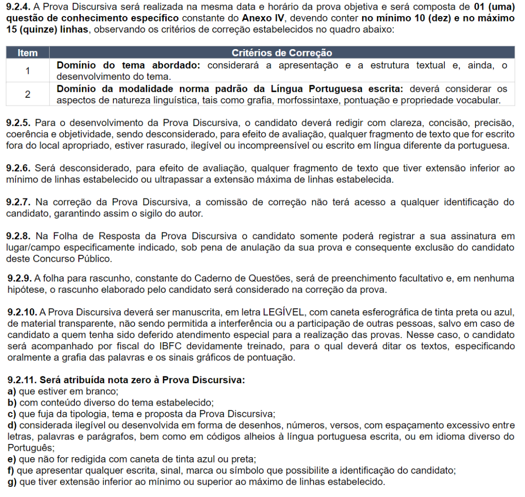 Abaixo, reunimos os pontos do edital que tratam dos critérios de correção da prova discursiva.
